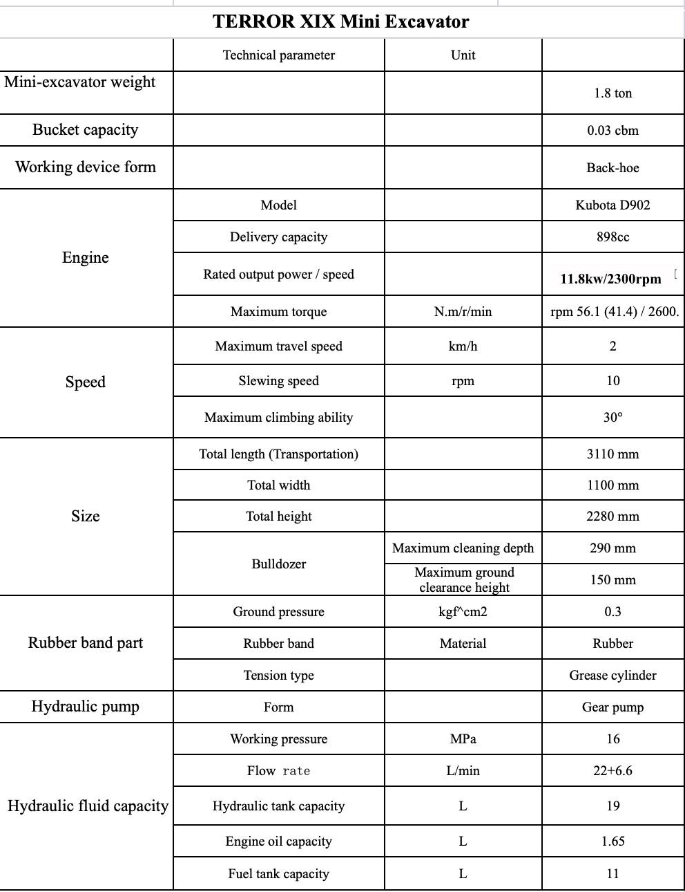What’s Included: The TYPHON TERROR XIX STORM mini excavator machine comes with 1 x standard digging excavator bucket, as well as 1 x tool box, 1 x canopy, and 1 x digital manual with all the instructions.